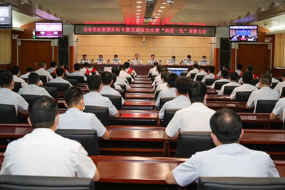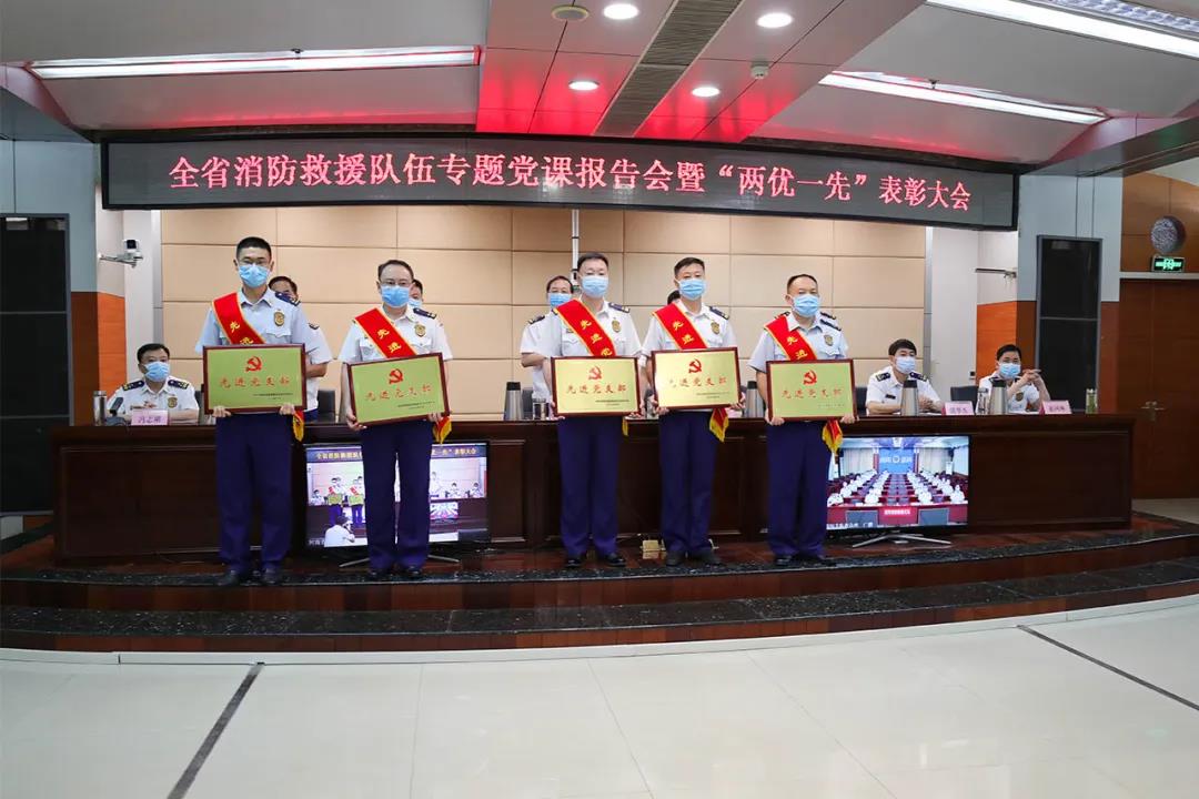總隊長李彥軍主持全省消防救援隊伍專題黨課報告會暨“兩優(yōu)一先”表彰大會,總隊黨委同志為受到表彰的先進基層黨組織、優(yōu)秀共產(chǎn)黨員和優(yōu)秀黨務(wù)工作者代表頒發(fā)了獎牌、證書。