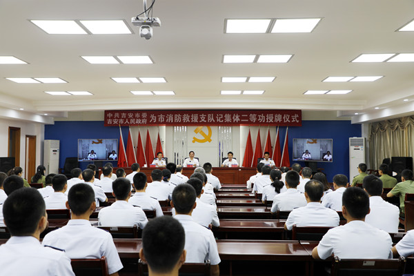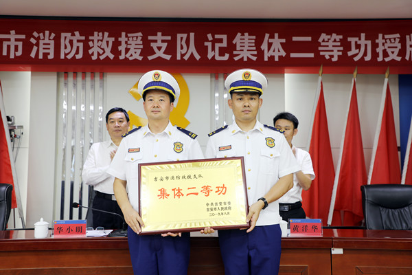 江西省消防救援總隊吉安市委、市政府舉行為市消防救援支隊記集體二等功授牌儀式