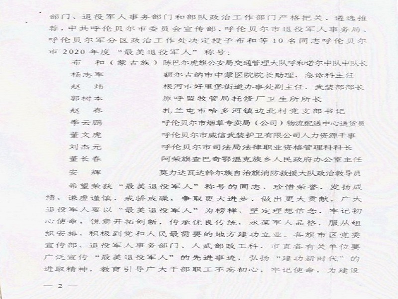 近日,中共呼倫貝爾市委員會宣傳部、呼倫貝爾市退役軍人事務(wù)局、呼倫貝爾市軍分區(qū)政治工作處授予呼倫貝爾市莫力達瓦旗消防救援大隊安輝同志為2020年度“最美退役軍人”榮譽稱號。