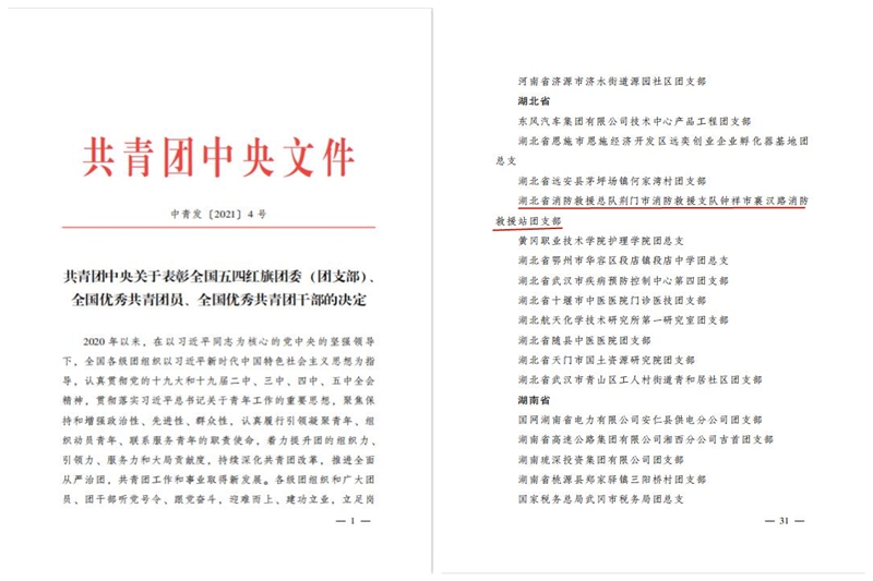 近日,共青團(tuán)中央下發(fā)《關(guān)于表彰全國五四紅旗團(tuán)委(團(tuán)支部)、全國優(yōu)秀共青團(tuán)員、全國優(yōu)秀共青團(tuán)干部的決定》,鐘祥市襄漢路消防救援站團(tuán)支部受共青團(tuán)中央表彰,榮獲“全國五四紅旗團(tuán)支部”稱號。