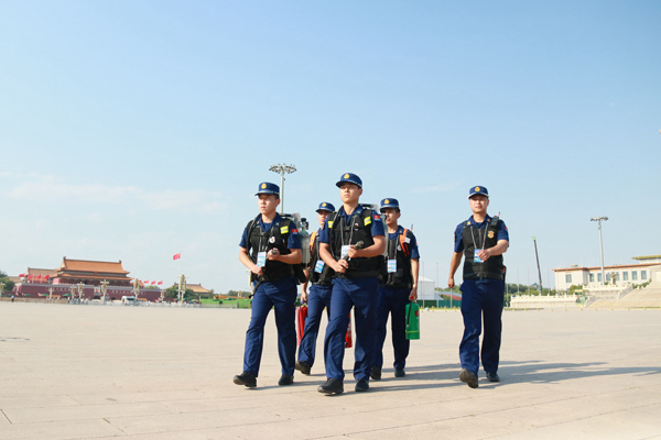 圖為蔡瑞(右一)帶領(lǐng)指戰(zhàn)員們在天安門廣場巡邏檢查。受訪者供圖