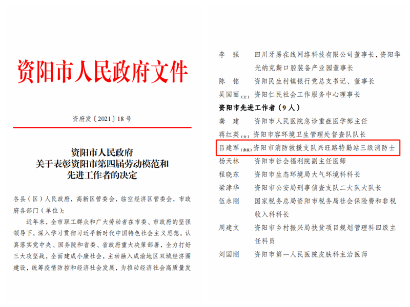 近日,資陽市人民政府印發(fā)了《關(guān)于表彰資陽市第四屆勞動(dòng)模范和先進(jìn)工作者的決定》,對全市各行各業(yè)涌現(xiàn)出的先進(jìn)模范人物予以通報(bào)表彰,資陽市消防救援支隊(duì)興旺路特勤站消防員呂建軍同志榮獲“資陽市先進(jìn)工作者”榮譽(yù)稱號(hào)。