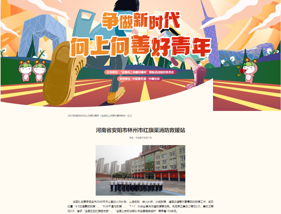 近日,共青團中央公布了2022年“全國向上向善好青年”名單,來自全國各行各業(yè)、各條戰(zhàn)線的142名優(yōu)秀青年和23個青年群體獲此殊榮。其中,河南省安陽市林州市紅旗渠消防救援站獲評“全國向上向善好青年群體”。