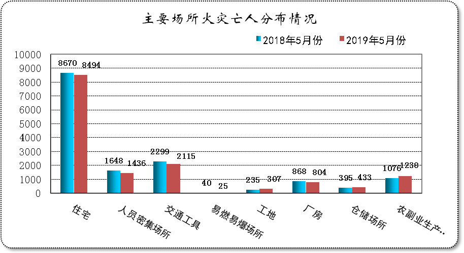 - 其他場(chǎng)所同比有所減少,其中住宅火災(zāi)減少2%、人員密集場(chǎng)所火災(zāi)減少12.9%、廠房火災(zāi)減少7.4%、交通工具火災(zāi)減少8%、易燃易爆場(chǎng)所火災(zāi)減少37.5%。