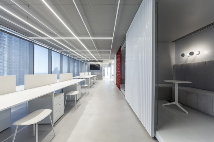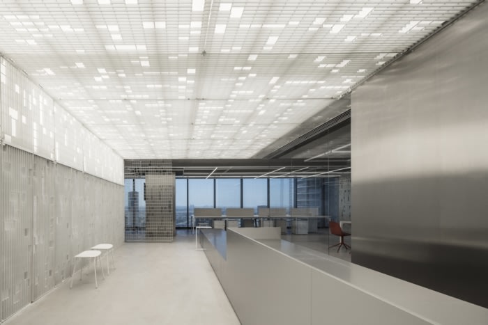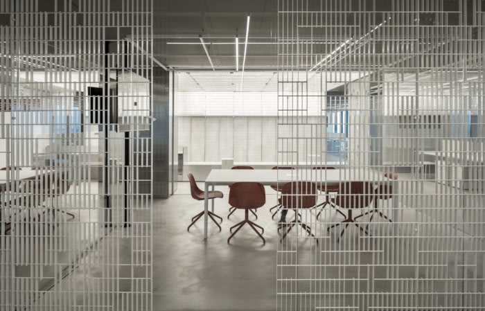鋼格柵被解開,以創(chuàng)造新的圖案,并從簡單的網(wǎng)格轉(zhuǎn)變?yōu)楣I(yè)蕾絲。這種編織隔墻產(chǎn)生分離而不堵塞空間。這種所謂的交織開放性,使人們能夠?qū)χ車某鞘芯坝^有一個(gè)微妙的、分層的看法。白色波紋聚碳酸酯板被設(shè)計(jì)成一個(gè)更可靠的隔板,以提供更多的隱私。該空間的配色方案全部為白色和灰色,帶有該公司品牌的紅色色調(diào)。材料調(diào)色板結(jié)合了時(shí)尚和工業(yè)——立柱和墻壁的鋁覆層,與混凝土地板和帶有白色油漆飾面的隔墻并列,以及白色波紋聚碳酸酯面板的分裂焊接網(wǎng)格。#濟(jì)南辦公室裝修#