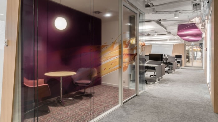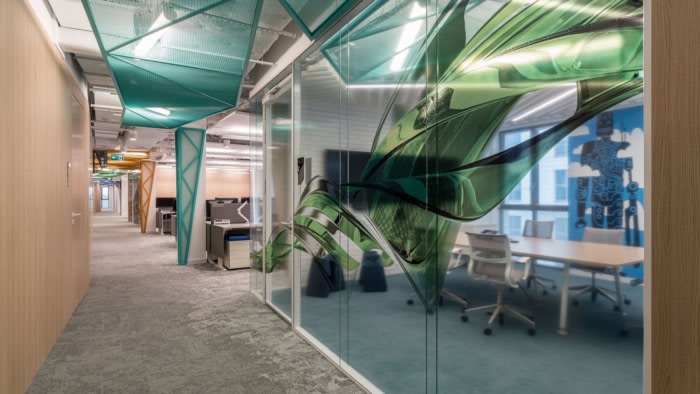 最初的想法是創(chuàng)造一個工業(yè)風(fēng)的辦公室,明亮的空間和創(chuàng)造一個工作氛圍。辦公室設(shè)計小組的設(shè)計師建議對樣式進行一些小的修改,以滿足客戶的偏好。他們將其描述為一個現(xiàn)代工業(yè)空間,通過對木材和明亮顏色的處理,將其切割成特殊的箔材,并出現(xiàn)在玻璃上。同時,他們將家具和裝飾性、彎曲、膨脹金屬(網(wǎng))的顏色強加給設(shè)計師,這些顏色延伸到天花板,部分延伸到墻壁。生動的屏幕顏色和動態(tài)形式在這個地方提供了不可或缺的正能量流,同時標記所有區(qū)域,以創(chuàng)造克拉科夫辦公室的原始和獨特空間。