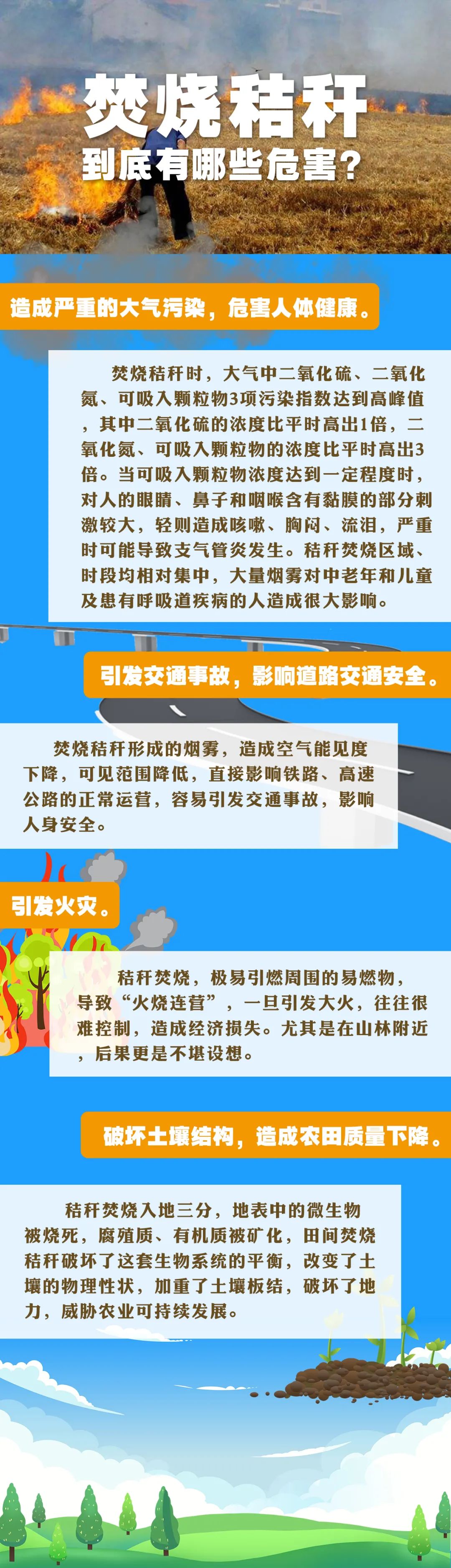 春季多風(fēng)干燥,焚燒秸稈不僅會(huì)污染環(huán)境,還可能引發(fā)大面積火災(zāi),嚴(yán)重威脅生命財(cái)產(chǎn)安全,屬于違法行為,學(xué)習(xí)正確處理秸稈的方式。