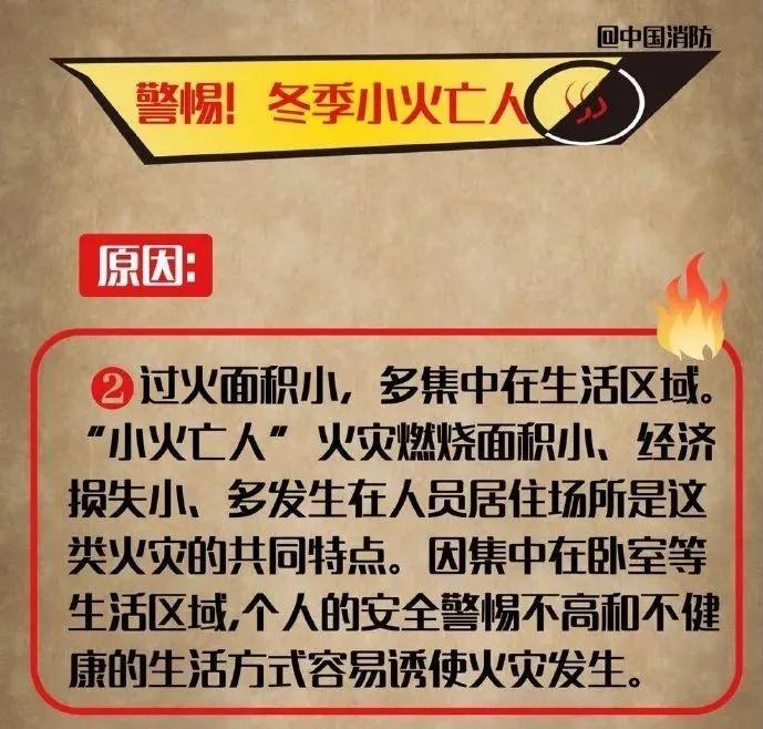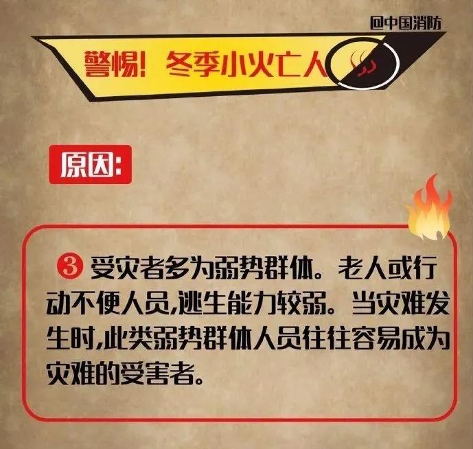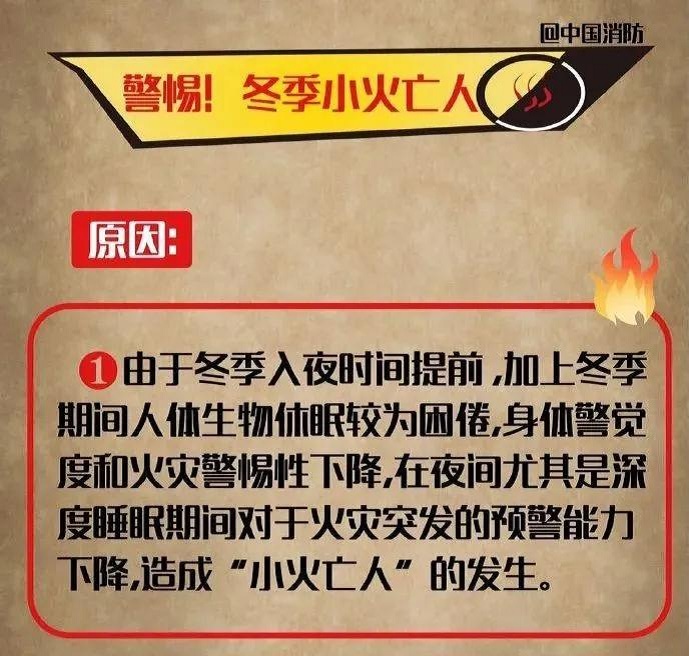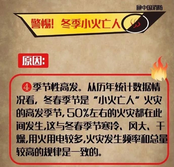 冬季天氣干燥,是火災(zāi)事故的高發(fā)季節(jié),稍有不慎,極易引發(fā)火災(zāi)。在近年來發(fā)生的火災(zāi)事故中,“小火亡人”火災(zāi)事故比例居高不下,學(xué)會正確認(rèn)識和預(yù)防很重要,一起讀圖了解。