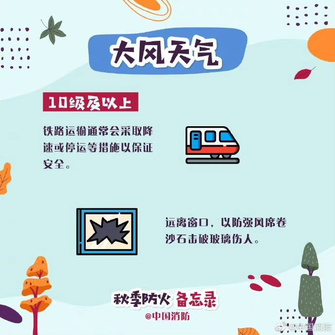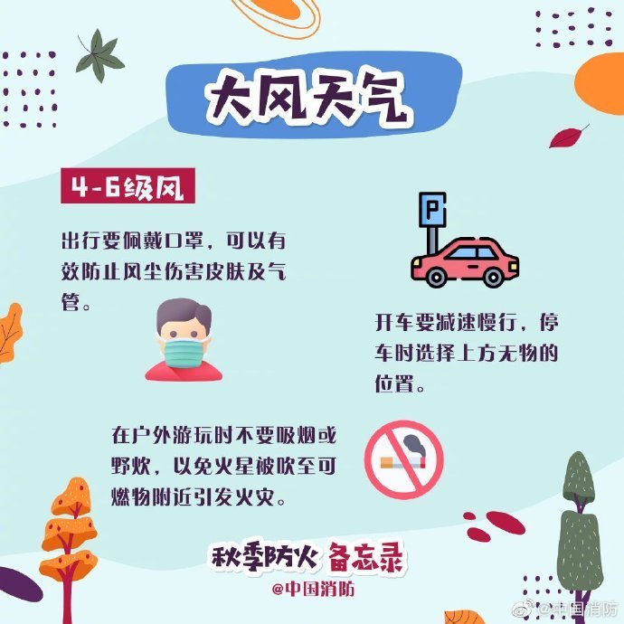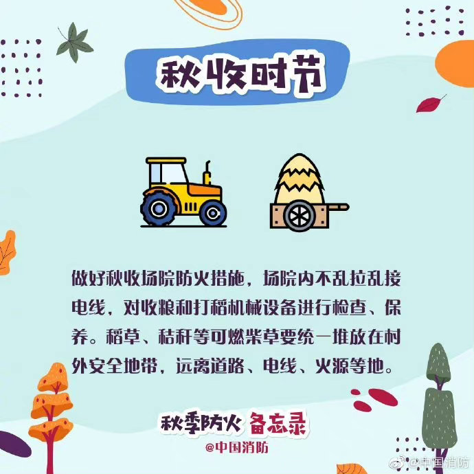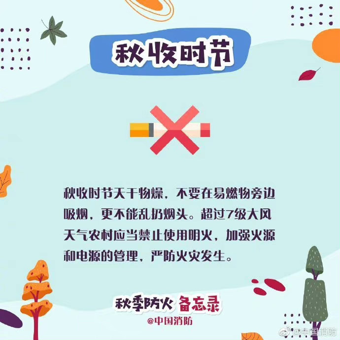 秋季風(fēng)大,氣候干燥,且又正逢秋收時節(jié),是火災(zāi)事故的高發(fā)期。進入秋季,外出活動要時刻注意天氣變化和用火安全,看圖查收秋季防火備忘錄↓↓ ????