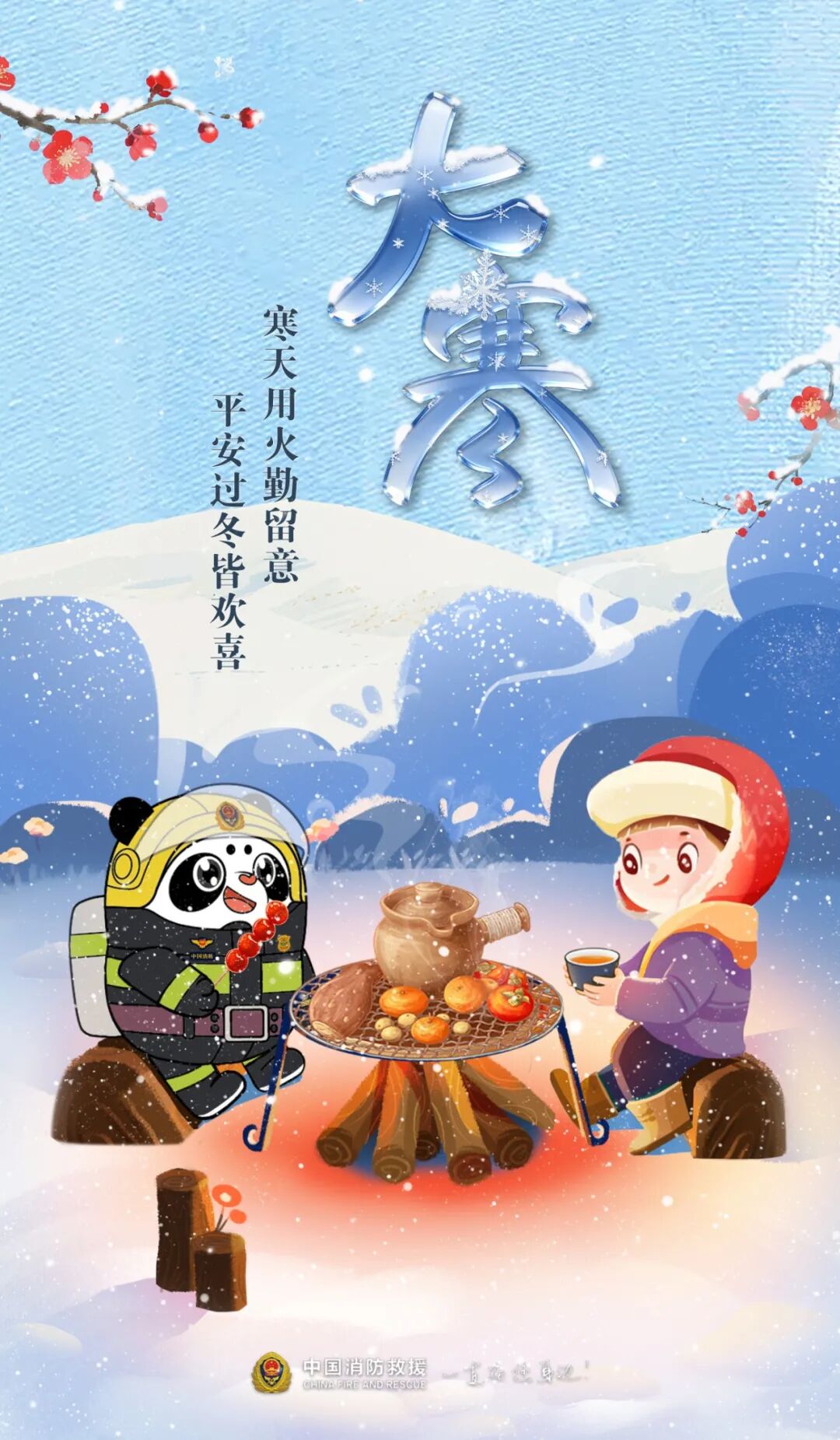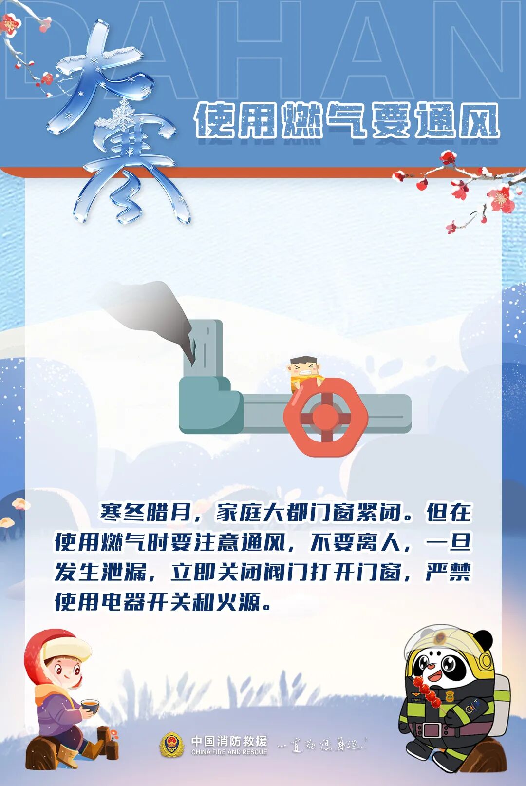 大寒是二十四節(jié)氣中最后一個(gè)節(jié)氣,也是我國(guó)大部分地區(qū)一年中最冷的時(shí)期。@中國(guó)消防大寒節(jié)氣安全科普海報(bào)上線,提醒大家:取暖用火用電用氣要規(guī)范,謹(jǐn)防一氧化碳中毒和火災(zāi)事故。天氣再冷,安全不能“降溫”。戳圖一起學(xué)習(xí),平安過(guò)冬!