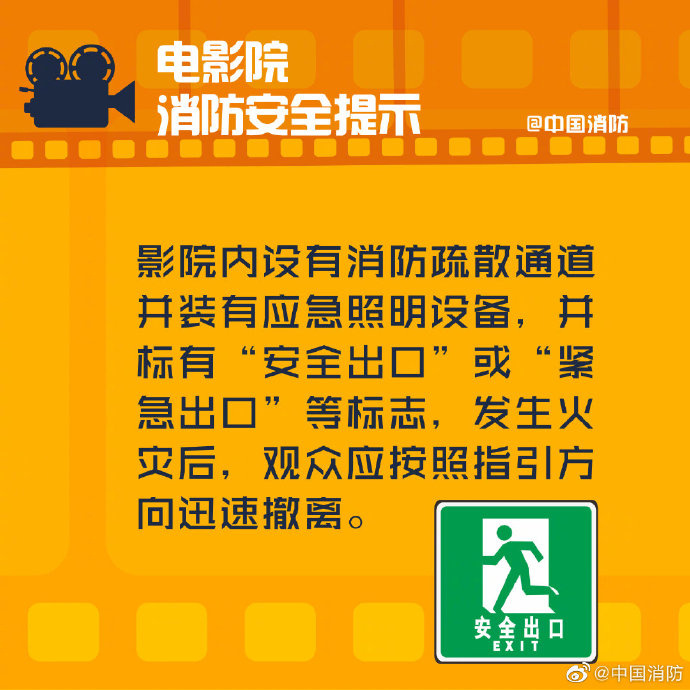大家去電影院看電影的同時(shí),消防安全不能忘!電影院屬于人員密集場(chǎng)所,一旦發(fā)生火災(zāi),后果不堪設(shè)想。戳圖了解電影院消防安全知識(shí)↓↓