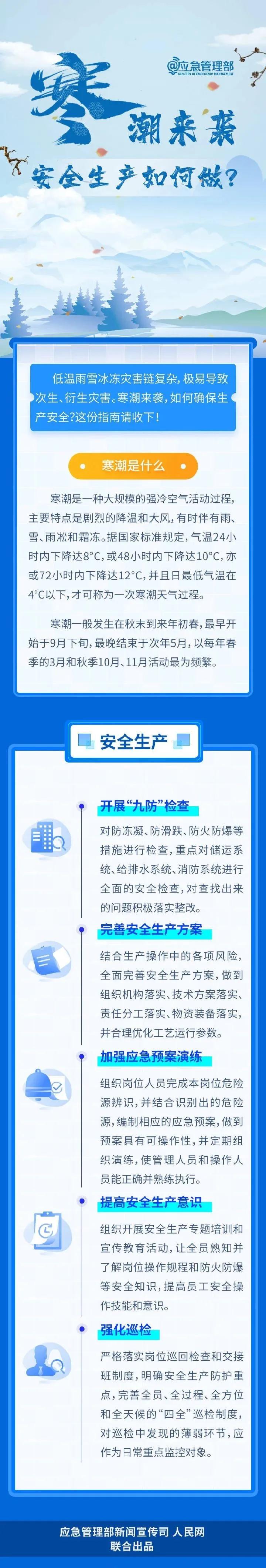 寒潮是一種大規(guī)模的強冷空氣活動過程,主要特點是劇烈的降溫和大風,有時伴有雨、雪和霜凍等。低溫雨雪冰凍災害鏈復雜,極易導致次生、衍生災害。寒潮來襲,如何確保生產安全?這份指南請收下!