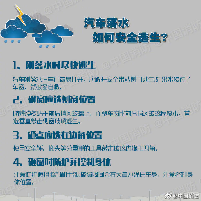 夏季暴雨多,來了怎么做,若不幸遇險(xiǎn),該如何自救,汽車落水,又要怎樣逃生?戳圖了解~