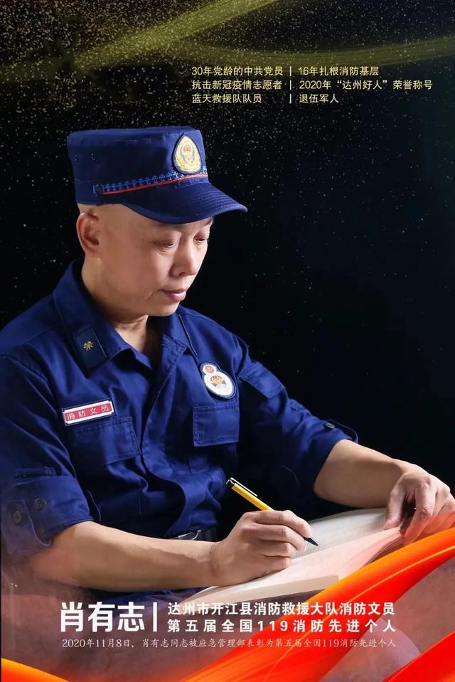1990年肖有志同志從消防部隊退伍后,懷著對消防工作的無比熱愛,以及對消防事業(yè)的無上崇敬,在2004年成為開江縣消防大隊的一名消防文員。