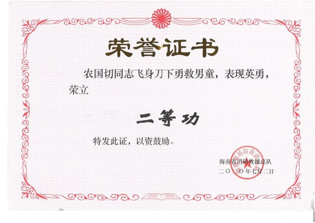 2014年,超強臺風(fēng)“威馬遜”在海南登陸,強降雨致使洋浦經(jīng)濟開發(fā)區(qū)萬宅村街道民房被淹,百余名群眾被困,情況危急。作為戰(zhàn)斗一班班長的農(nóng)國切同志主動請戰(zhàn),哪里有險情,他就帶領(lǐng)著本班戰(zhàn)斗員頂著狂風(fēng)暴雨戰(zhàn)斗在哪里,連續(xù)奮戰(zhàn)在人民群眾最需要的地方,成功疏散遇險群眾60多人。