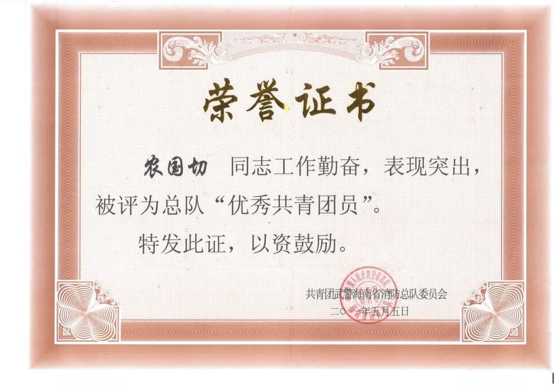 參加工作11年以來,農(nóng)國切同志歷任副班長、班長、中隊長助理,從戰(zhàn)斗員到分隊長,始終堅持戰(zhàn)斗在消防救援第一線,先后榮立二等功1次、三等功1次,獲得 “優(yōu)秀共產(chǎn)黨員”“優(yōu)秀共青團員”“海南青年五四獎?wù)隆薄坝?xùn)練能手”等榮譽。并于2020年獲第五屆全國119消防先進個人。