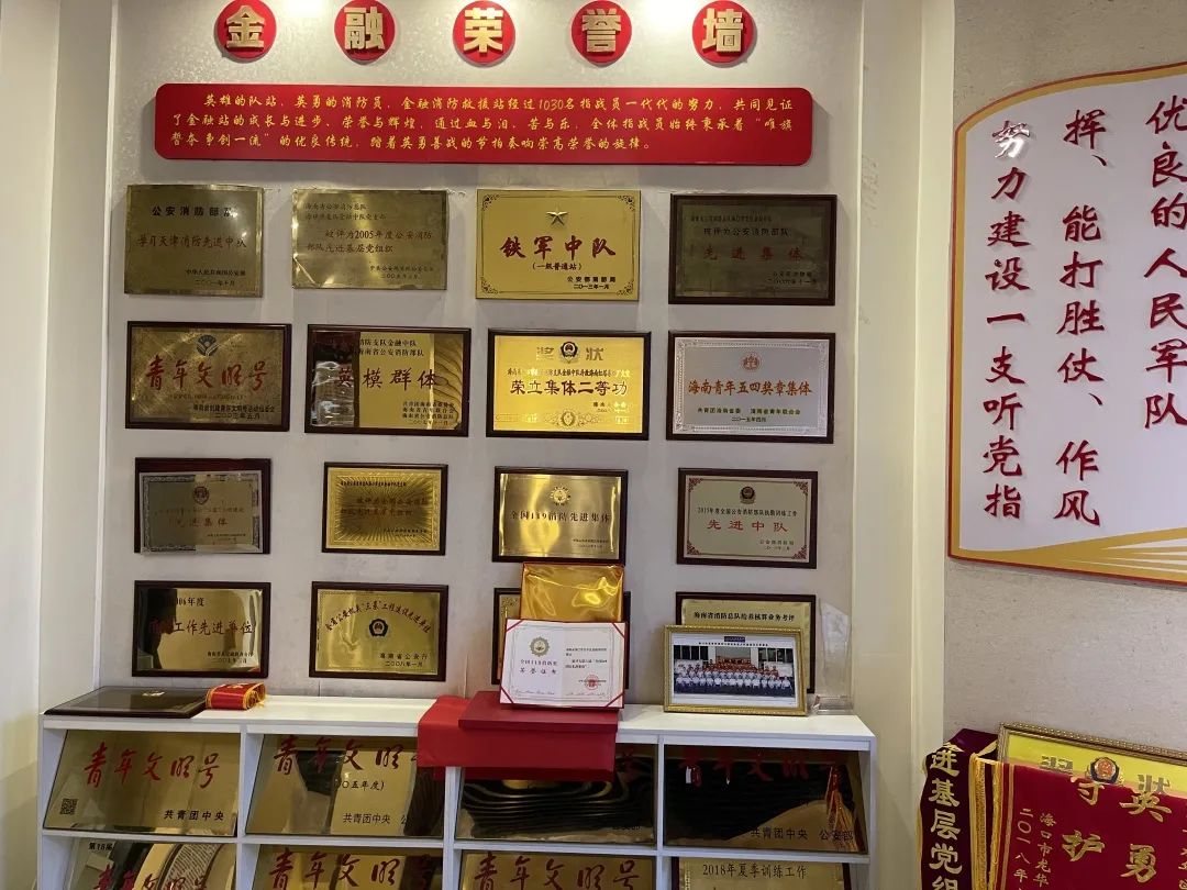 在金融消防站的榮譽(yù)室,擺滿了獎(jiǎng)牌和錦旗,一塊塊獎(jiǎng)牌,一面面錦旗,包含著黨和人民的信賴和重托。這些殊榮的背后,是每一位忠于祖國忠于人民的金融人無悔的奉獻(xiàn)。