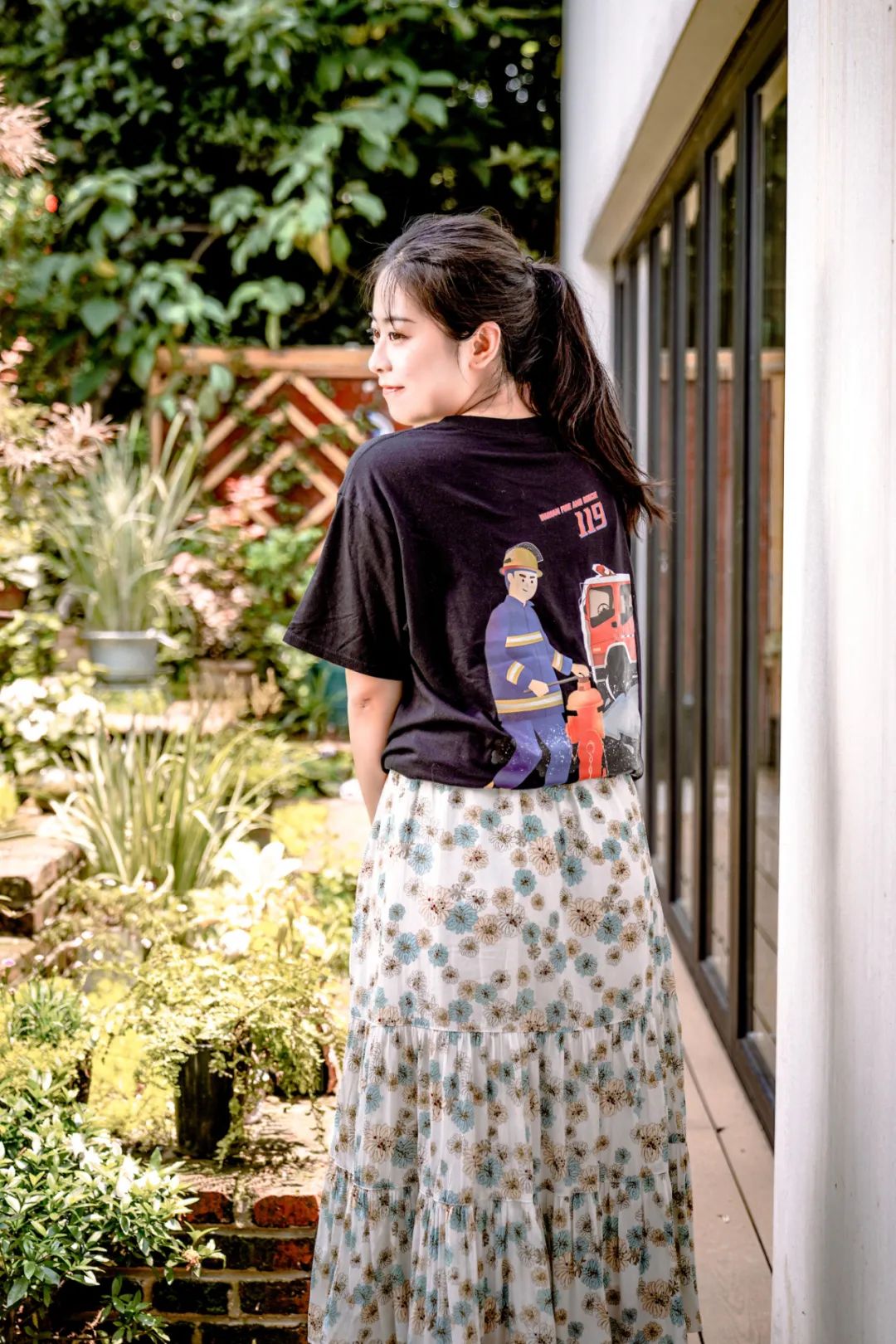 正面是簡單的文字logo,背面是可愛風格的消防插畫,寬松舒適的剪裁勾勒出休閑慵懶的夏日風。不論是長裙短裙還是長褲短褲都能隨意搭配,輕松撫平身材焦慮。