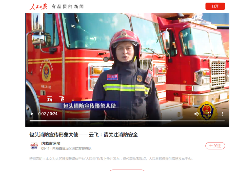 目前,消防公益宣傳片在部消防救援局官網(wǎng)、人民日報APP、今日頭條APP等平臺播出,通過包頭市樓宇電視、LED屏循環(huán)播放,并通過包頭市消防救援支隊官方微博、微信、抖音、快手等新媒體平臺播放,通過明星的社會示范效應(yīng),帶動更多的民眾學(xué)習(xí)消防知識,參與消防宣傳。