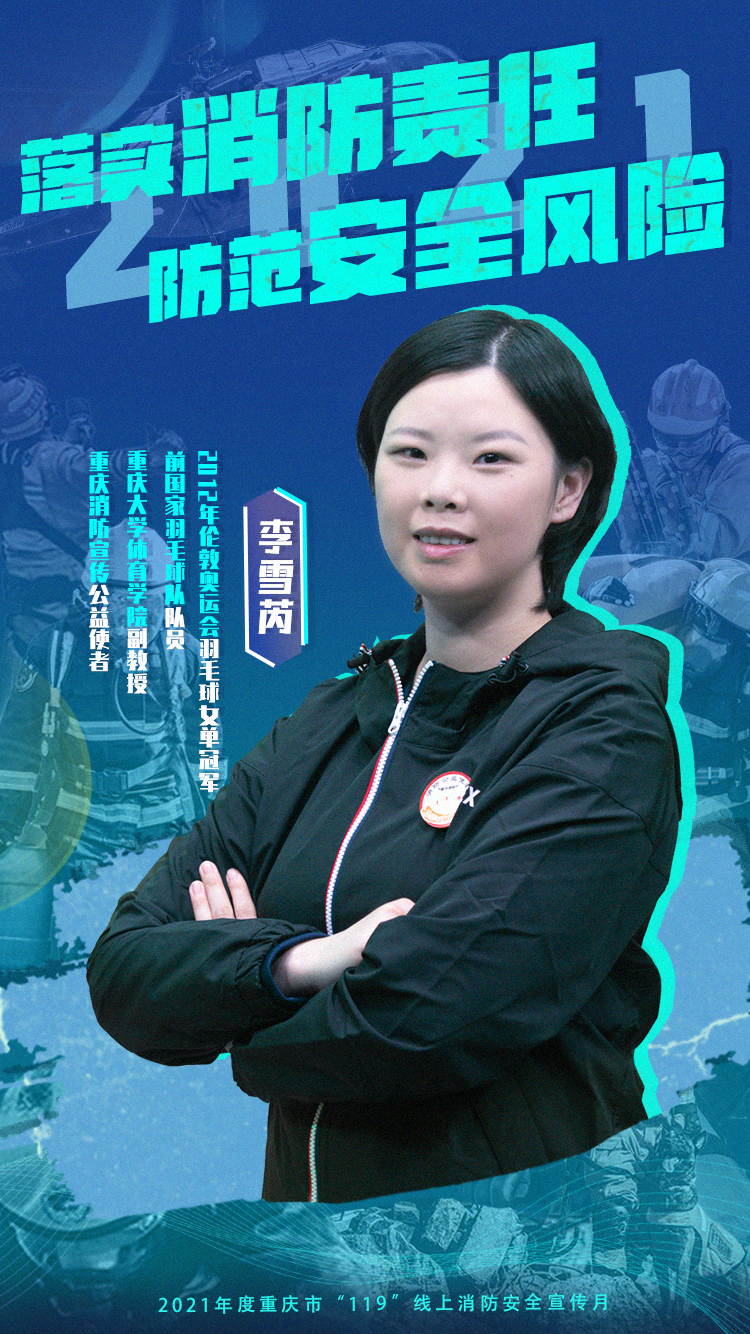 本次“119”線上消防安全宣傳月,我們也邀請(qǐng)到一位特殊的嘉賓,她是2012倫敦奧運(yùn)會(huì)羽毛球女單冠軍、前國(guó)家羽毛球隊(duì)隊(duì)員、重慶大學(xué)體育學(xué)院副教授李雪芮。今天起,她還有一個(gè)新的身份——重慶消防宣傳公益使者。