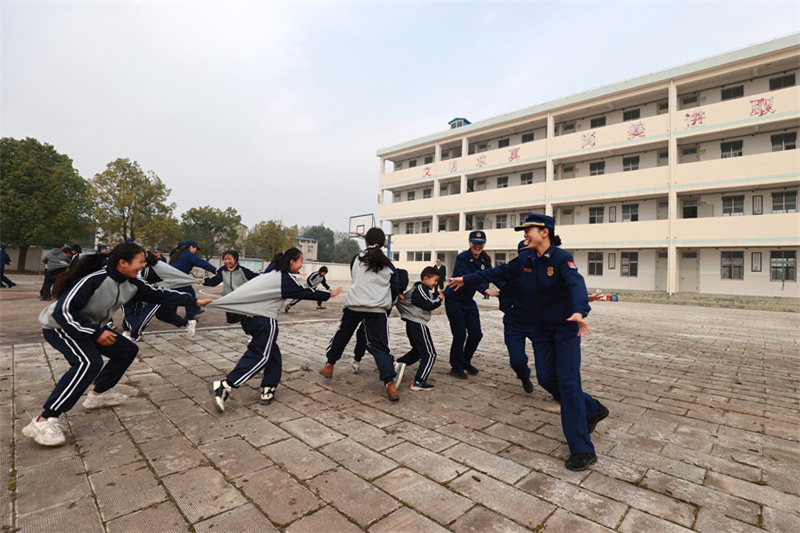 考慮到孩子們平時缺少父母的陪伴,志愿服務(wù)隊還為孩子們精心設(shè)計了“心有靈犀”“老鷹捉小雞”等游戲互動環(huán)節(jié),隊員們和孩子們在操場上你追我趕,很快玩成了一片,孩子們也從開始的靦腆害羞變得活潑開朗起來?!敖裉觳坏珜W(xué)到了消防知識,還收到了禮物,真的好開心,希望你們能常來?!绷昙壍泥u樂珊興奮地說。