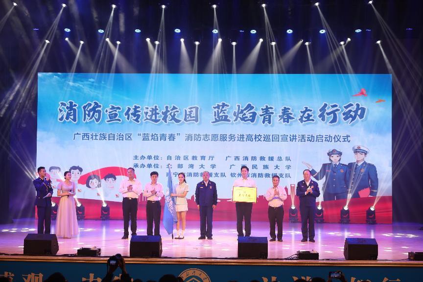 儀式上,與會(huì)領(lǐng)導(dǎo)共同點(diǎn)亮了“藍(lán)焰青春”消防志愿服務(wù)進(jìn)高校巡回宣講活動(dòng)啟動(dòng)球,并為北部灣大學(xué)“藍(lán)焰青春”消防志愿服務(wù)社團(tuán)授旗授牌。