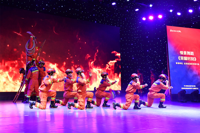 第一篇章《傳承?我們的光輝歲月》以紅色為主基調(diào),回顧了新中國成立以來消防隊伍改革發(fā)展歷程;主題講述《軍帽的故事》,現(xiàn)場還原了消防員為95歲抗戰(zhàn)老兵尋找軍帽的感人故事,展現(xiàn)出隊伍傳承紅色基因的使命擔當;音樂快板《高擎隊旗永向前》講述了支隊改革轉(zhuǎn)制四年來的工作成果和昂揚的精神風貌。黨的二十大代表鄧紅、李銀江,以及周恩來同志親屬、生前身邊工作人員周秉德、高振普,淮安消防轉(zhuǎn)業(yè)干部代表周懷仁、宋劍峰通過視頻的方式,寄語消防員,表達殷殷祝福。