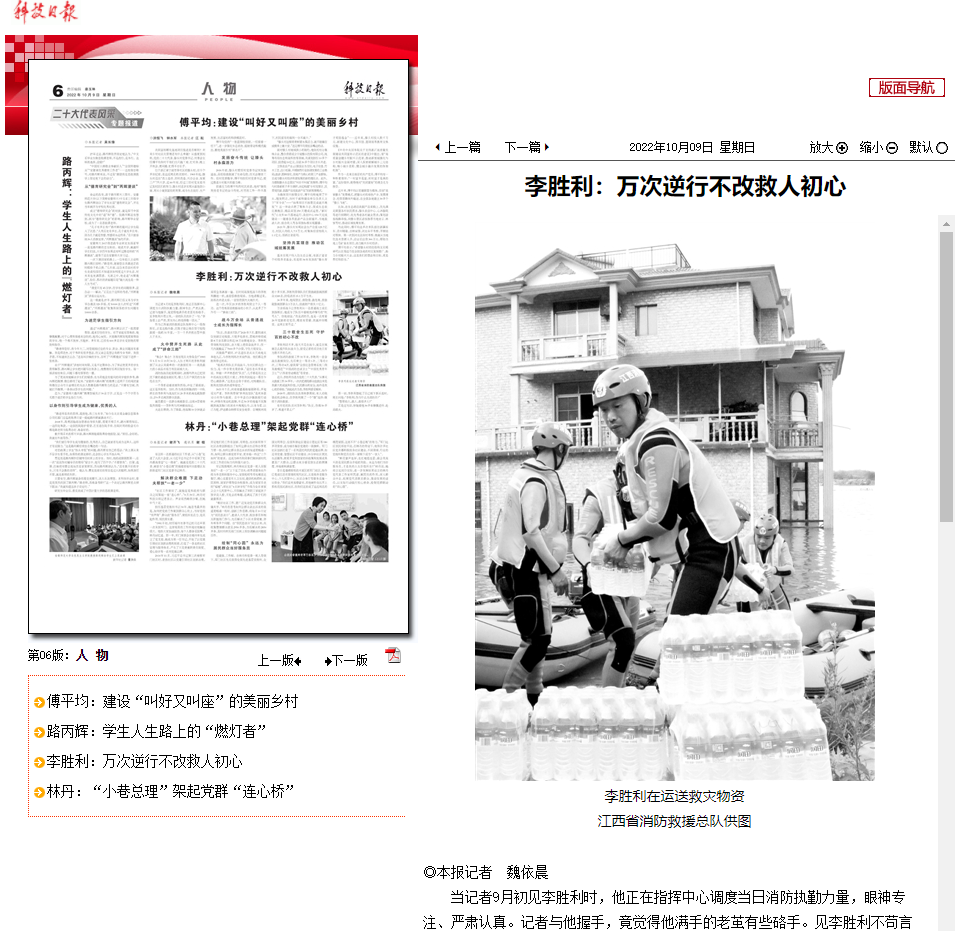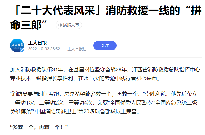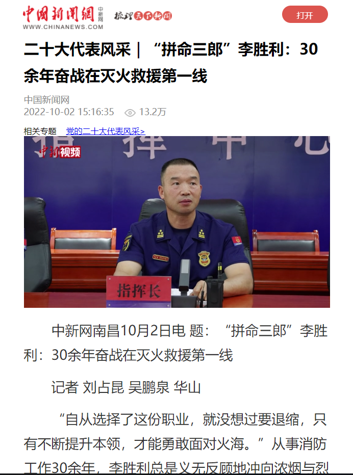 近日,人民日報、新華社、中央廣播電視總臺、光明日報、經(jīng)濟日報、人民政協(xié)報、科技日報、工人日報、中國新聞網(wǎng)、江西日報、江西衛(wèi)視等中央、省級主流媒體在“二十大代表風采”欄目集中宣傳報道了江西二十大代表、省消防救援總隊指揮中心專業(yè)技術(shù)一級指揮長李勝利先進事跡。