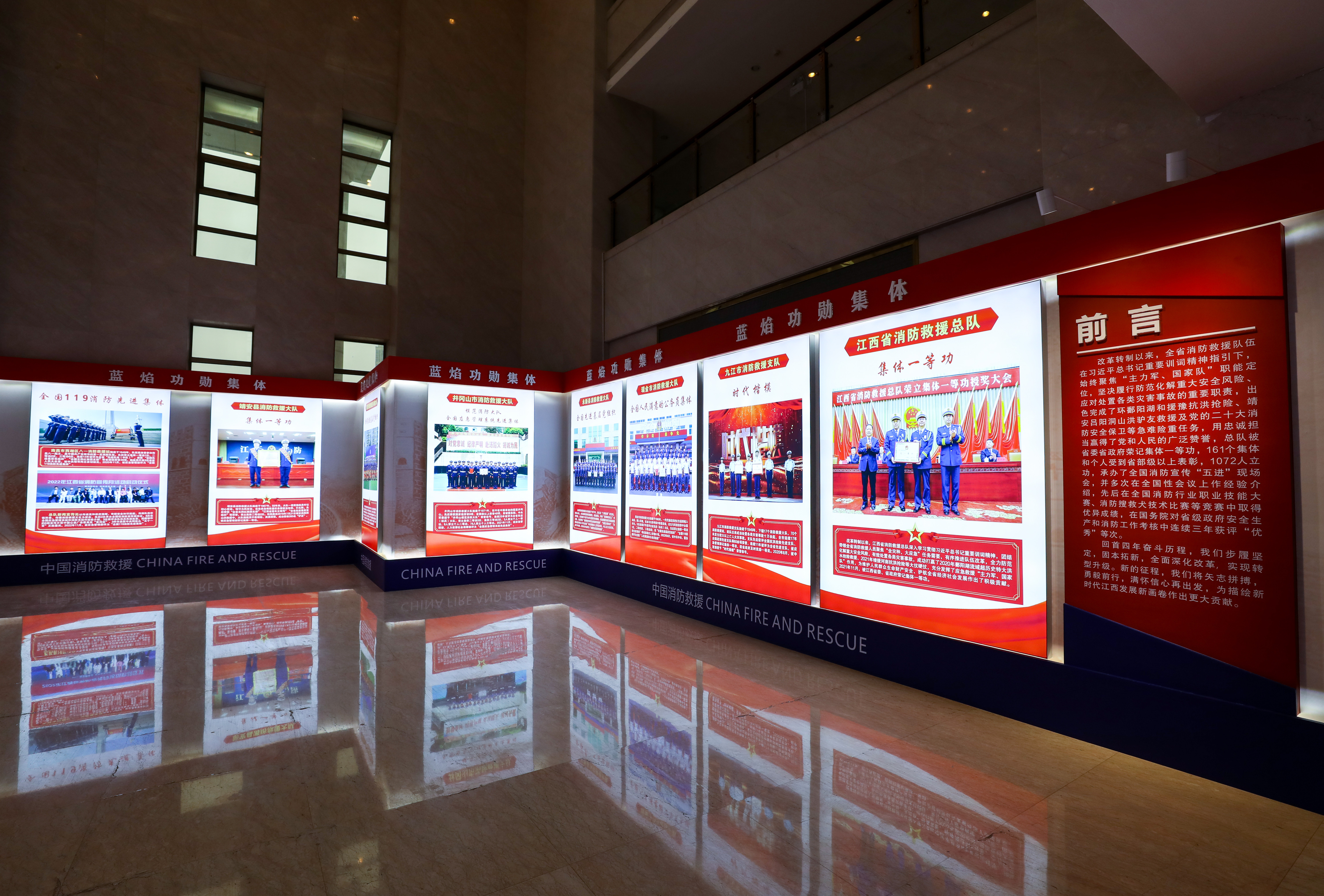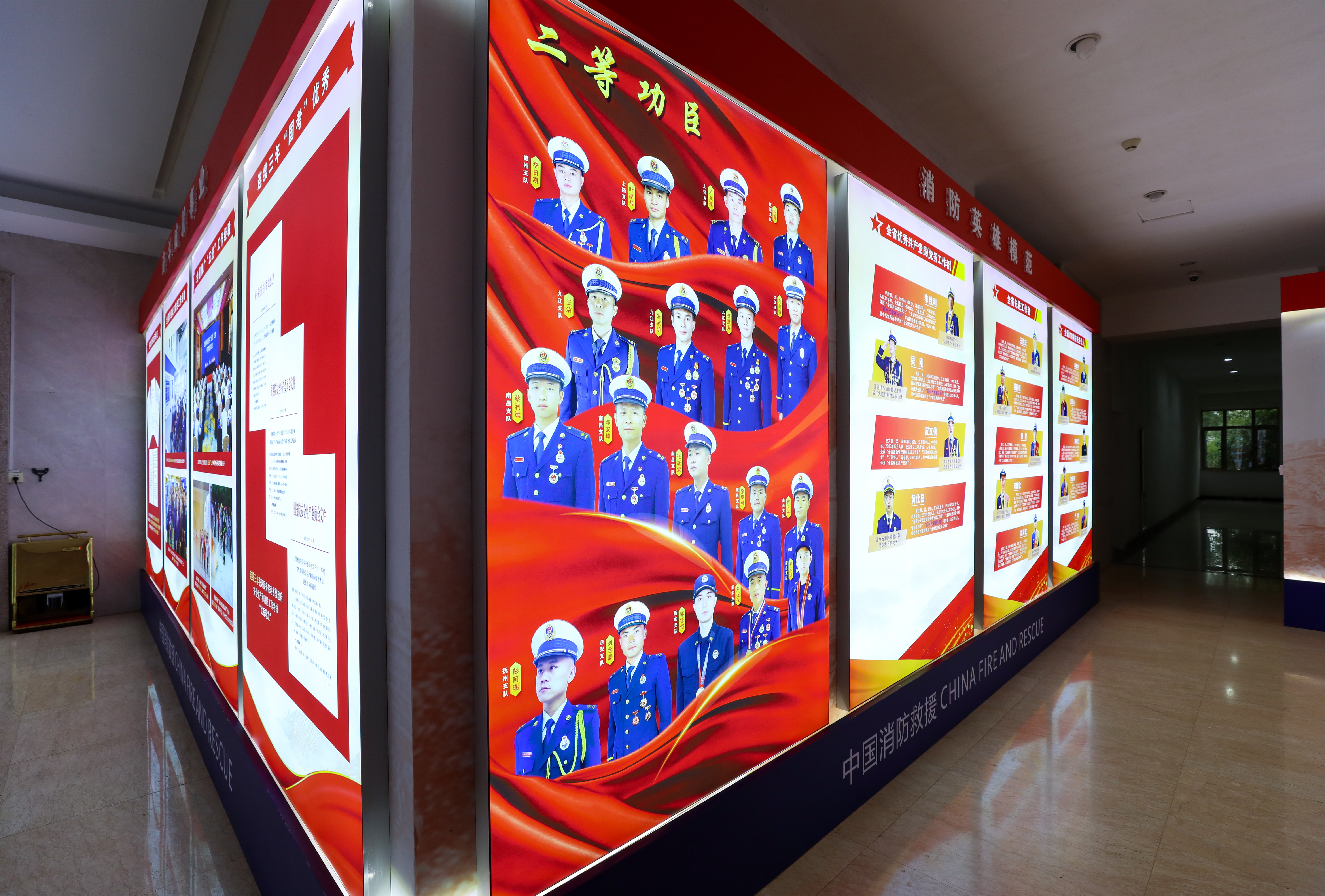 為深入學(xué)習(xí)貫徹習(xí)近平總書記重要訓(xùn)詞精神,進(jìn)一步激勵(lì)廣大指戰(zhàn)員時(shí)刻牢記領(lǐng)袖囑托、忠誠(chéng)履行職責(zé)使命,近日,江西省消防救援總隊(duì)在機(jī)關(guān)一樓大廳設(shè)計(jì)制作一批燈箱展板,集中展示改革轉(zhuǎn)制四年來(lái)全省消防救援隊(duì)伍重大先進(jìn)典型和主要工作業(yè)績(jī)。