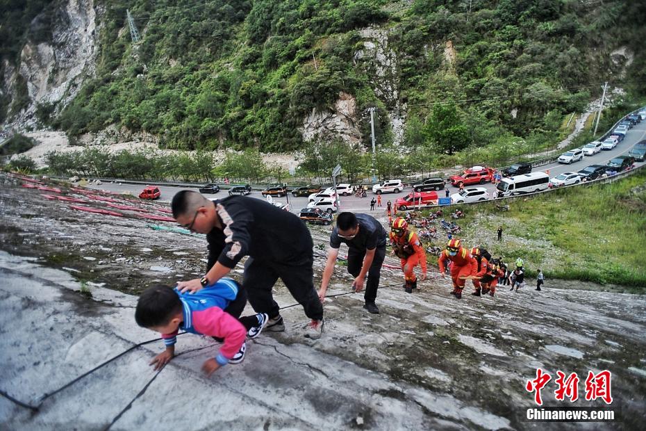 圖為消防救援人員路遇山體滑坡、道路中斷,攀爬前往瀘定磨西鎮(zhèn)。 四川消防供圖