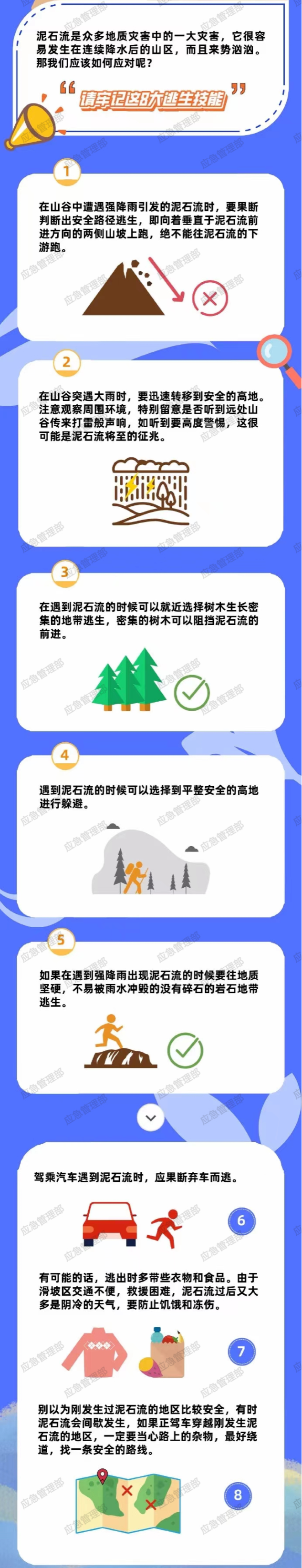 1. 沉著冷靜勿慌亂,向垂直于滾石前進(jìn)或滑坡方向的兩側(cè)逃離,并盡快在周圍尋找安全地帶。