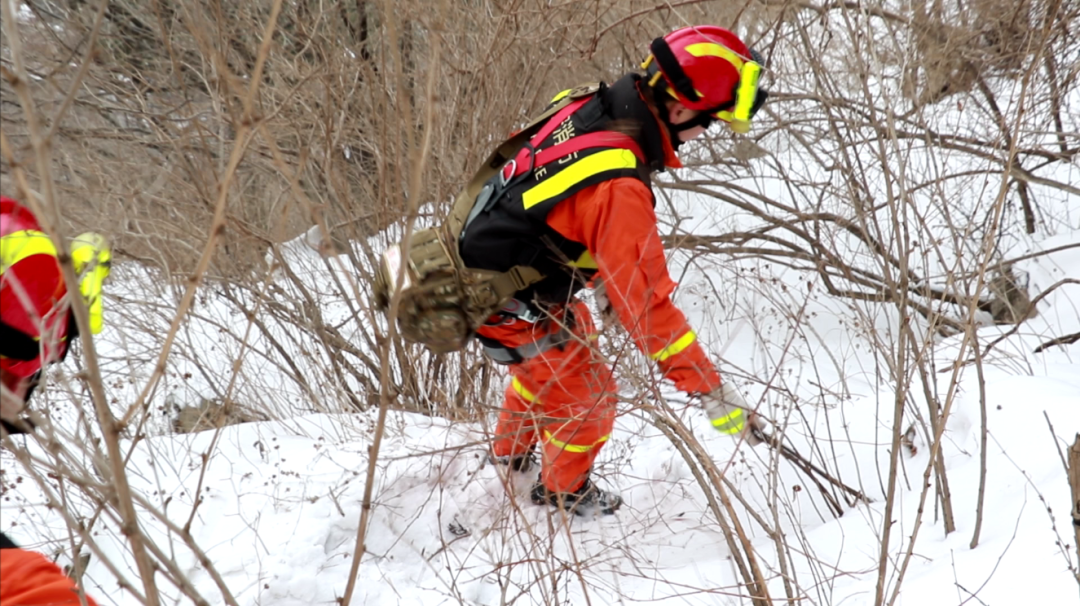 經(jīng)詢問報(bào)警人得知,跳崖者是一名18歲女孩,與家人發(fā)生矛盾,從拱北石西側(cè)跳下懸崖。因事發(fā)前幾天剛下過大雪,積雪足足有半米厚,消防員根據(jù)現(xiàn)場(chǎng)情況迅速制定營(yíng)救方案。