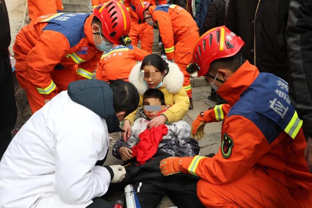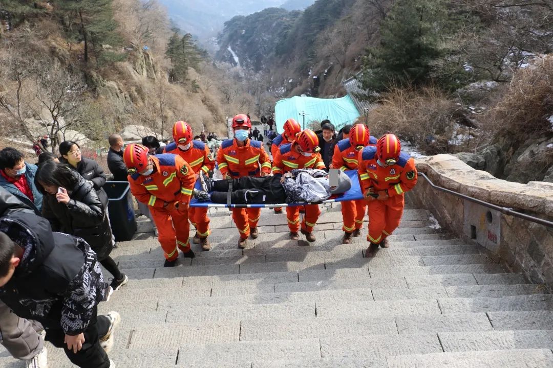 2月7日泰山十八盤有一男孩摔傷,需盡快就醫(yī)。接警后,泰山消防救援站立即出動(dòng)。