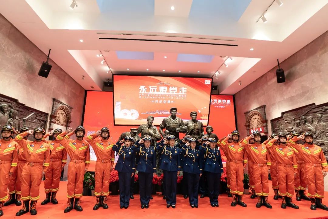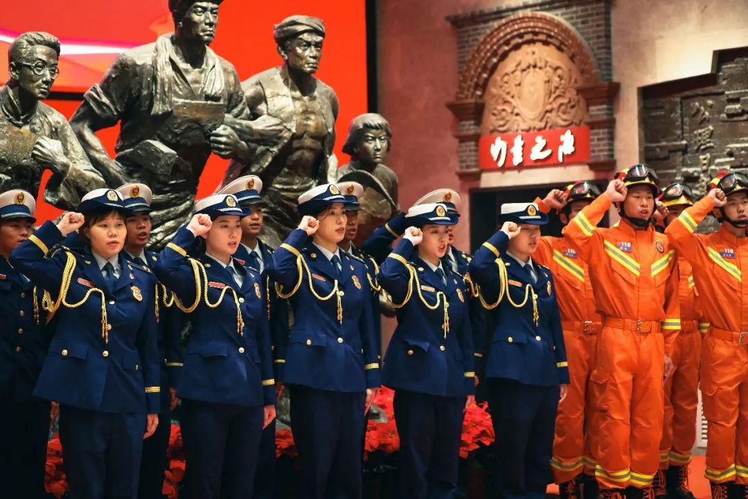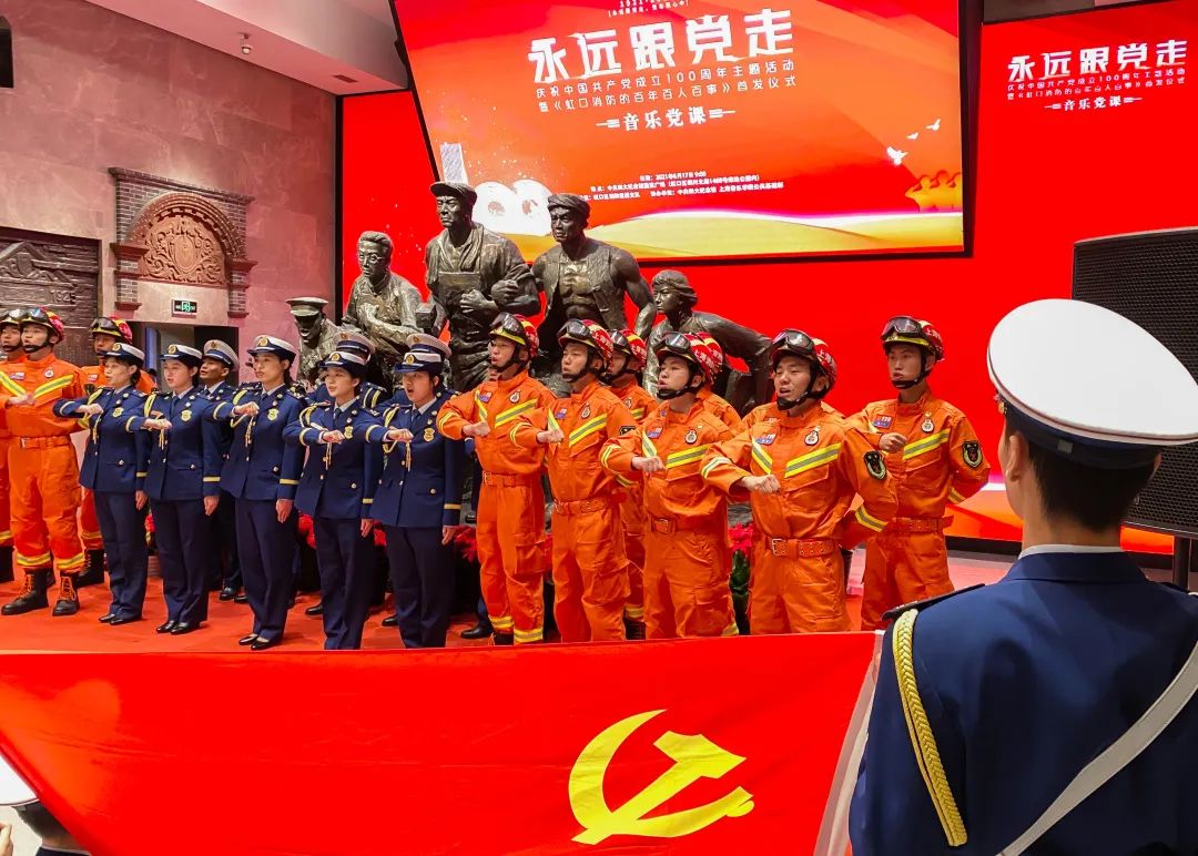 傳承紅色基因、肩負光榮使命?,F(xiàn)場,虹口區(qū)消防救援支隊指戰(zhàn)員們演唱《黨旗下的誓言》。