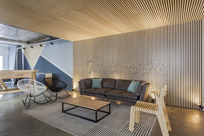 辦公室位于一樓,環(huán)境非常涼爽,墻壁上覆蓋著幾何圖形。當(dāng)你進(jìn)入這個(gè)空間時(shí),你的注意力會(huì)被一塊覆蓋在墻壁和天花板上的大木板吸引。松木板條的垂直方向變成了水平方向,形成了公司的標(biāo)志。#辦公室裝修案例#
