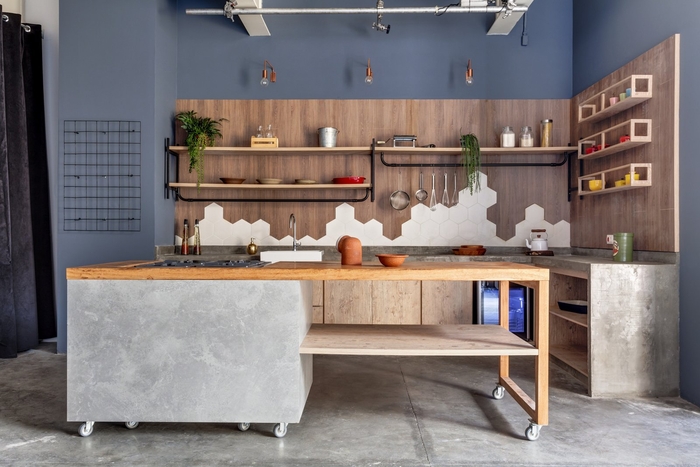 整個(gè)辦公室的桌子、椅子和櫥柜上都重復(fù)著同樣的木質(zhì)圖案。桌面由黑色的福美卡制成,并配有一根中央管道來(lái)隱藏電線,以及一個(gè)可以支撐植物花瓶和其他物體的支架。#濟(jì)南辦公室裝修#