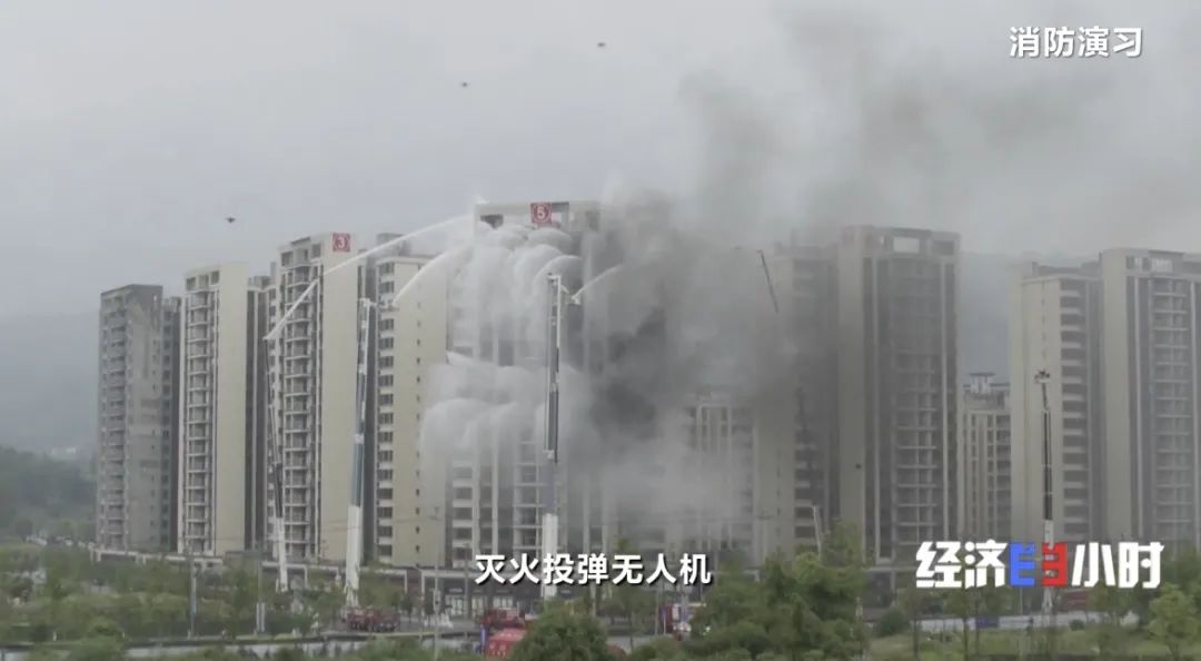 模擬演習(xí)中,消防無人機(jī)群聯(lián)袂救火,實現(xiàn)了聚焦定位、投放救生器材、投放干粉滅火彈、噴射泡沫、干粉滅火劑等功能,成功撲滅了高層火情。