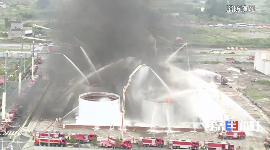 其中一個演習(xí)場景是當(dāng)?shù)匾粋€大型石油儲罐區(qū)輸油管線出現(xiàn)破裂,大量汽油泄漏,嚴(yán)重威脅防護(hù)堤內(nèi)多個石油儲罐的安全。經(jīng)過高噴車、重型泡沫車、大流量拖車炮、滅火機(jī)器人等特種滅火裝備投入戰(zhàn)斗,成功將大火撲滅。