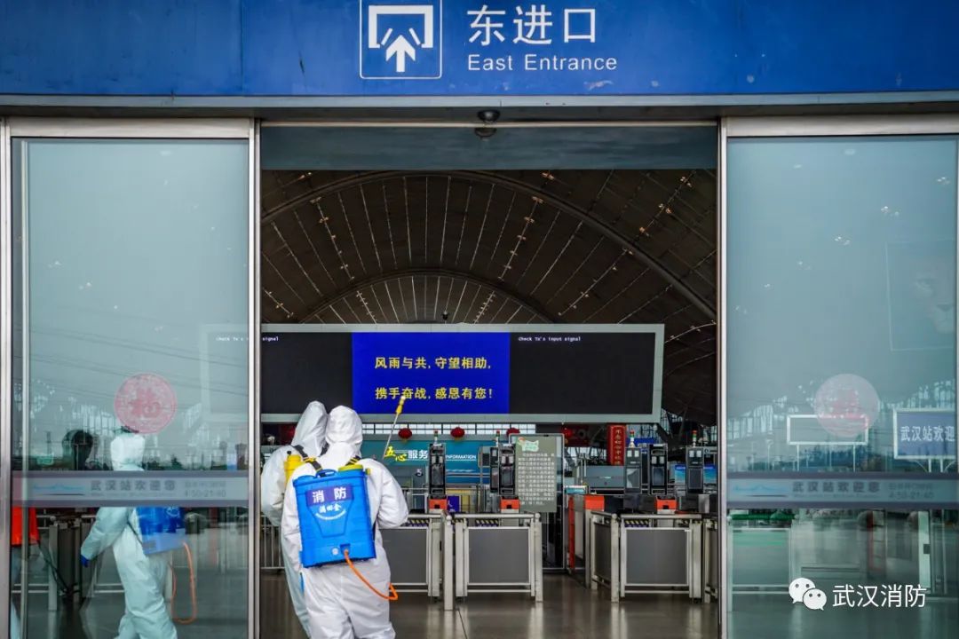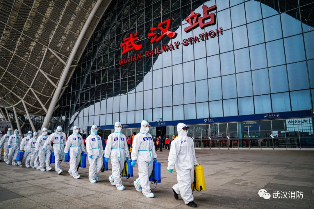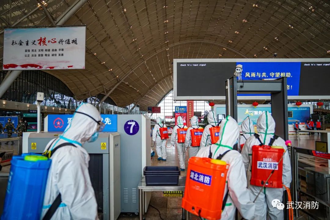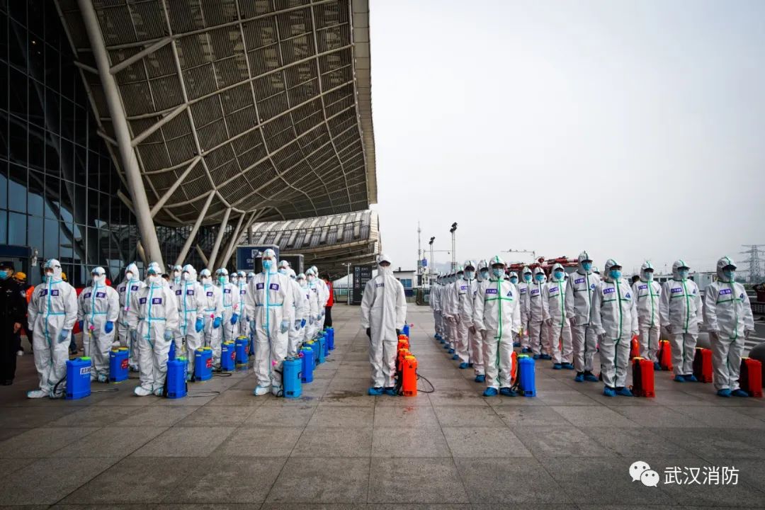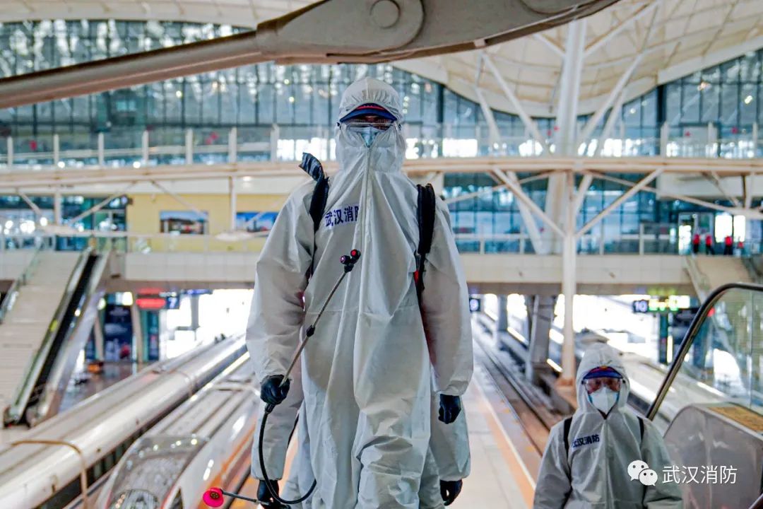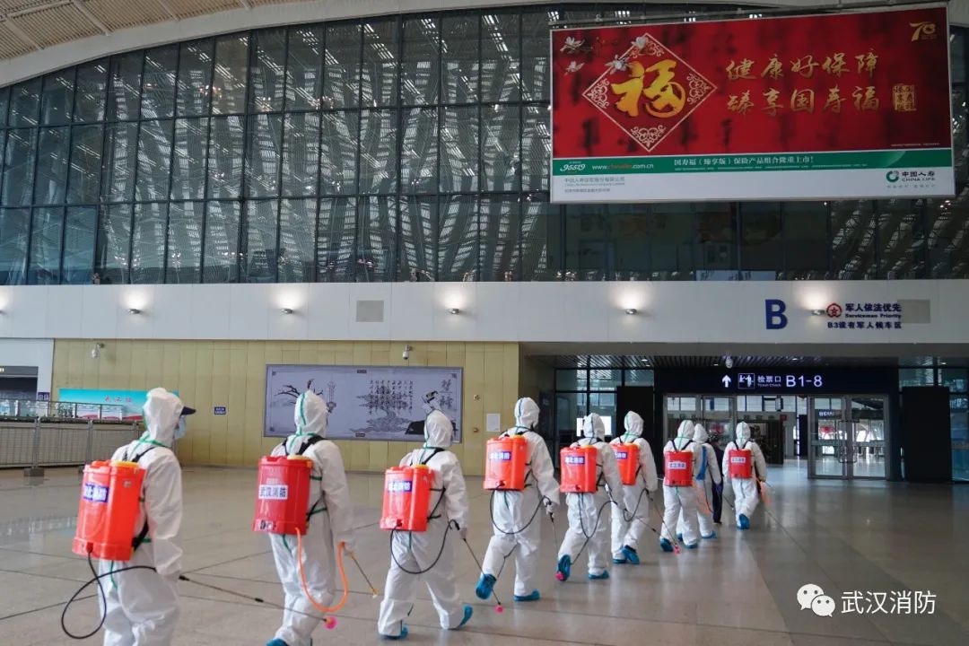武漢站前,80 名攜帶專業(yè)消毒設(shè)備的消防員集結(jié)到位。