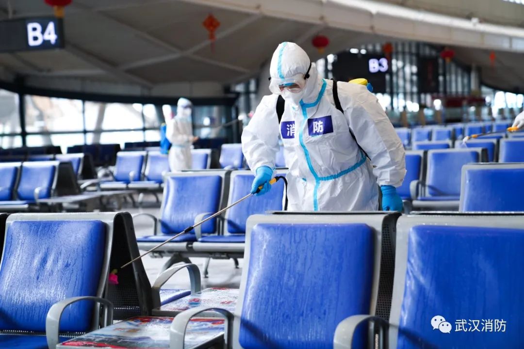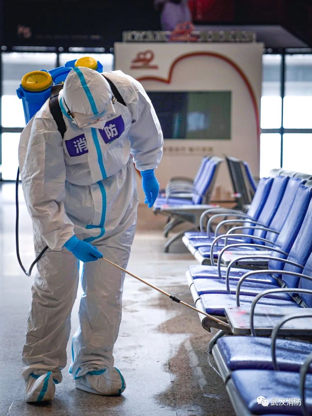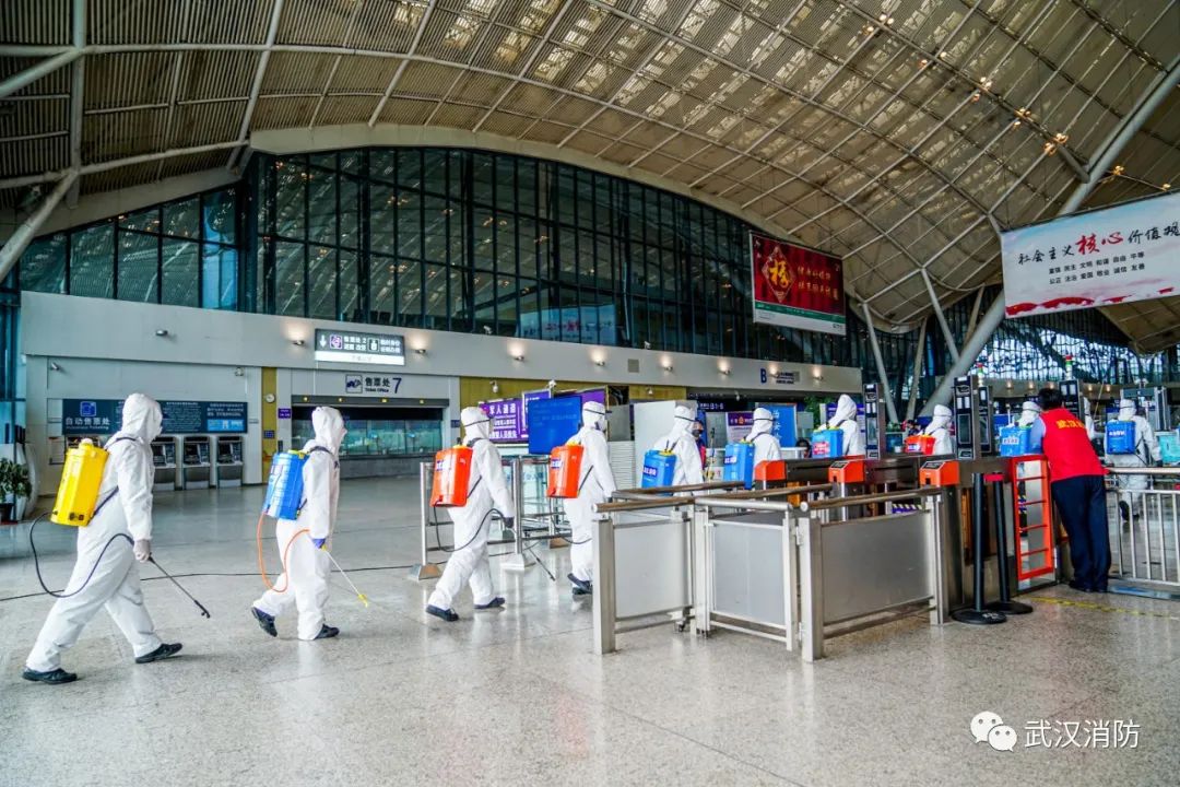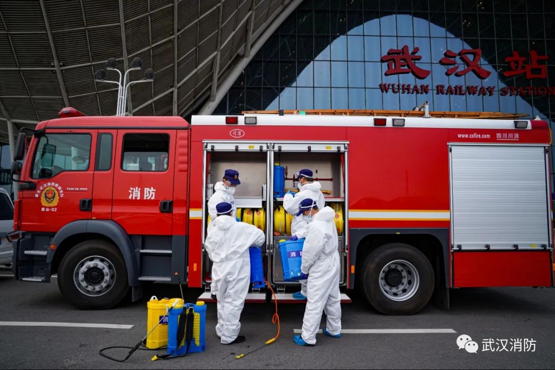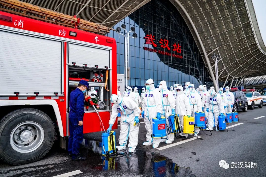 武漢站前,80 名攜帶專業(yè)消毒設(shè)備的消防員集結(jié)到位。