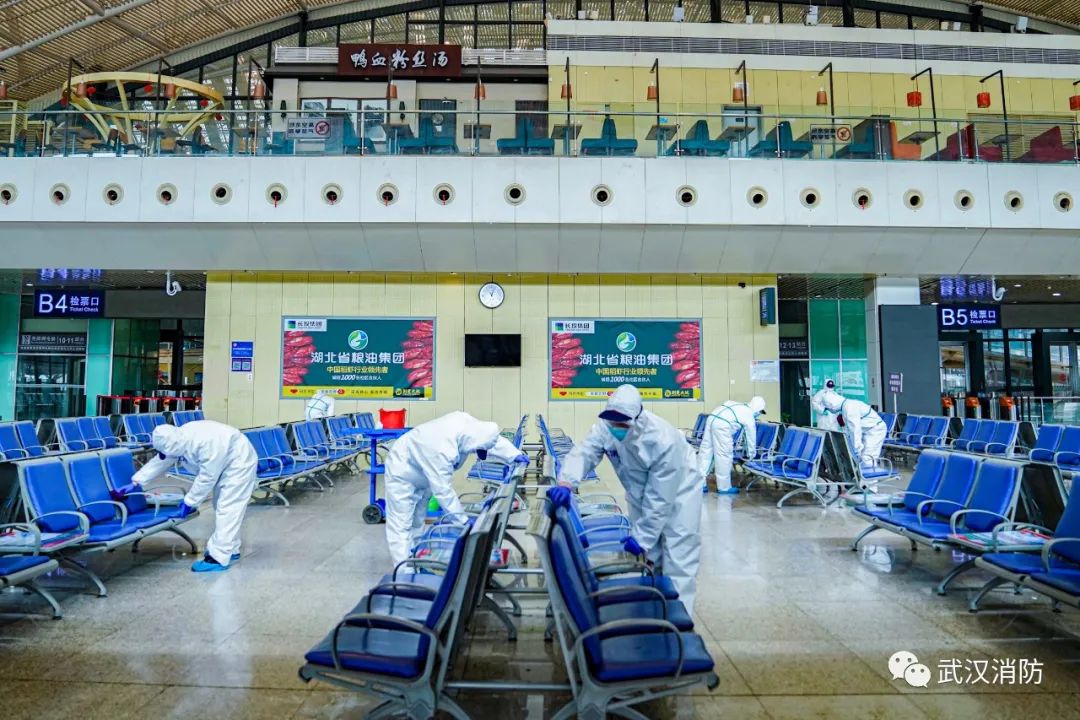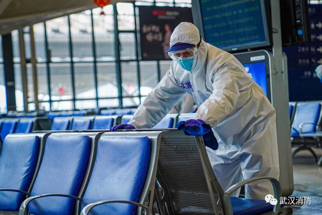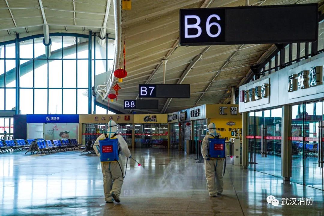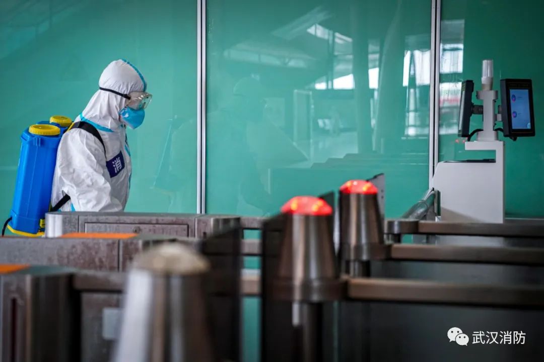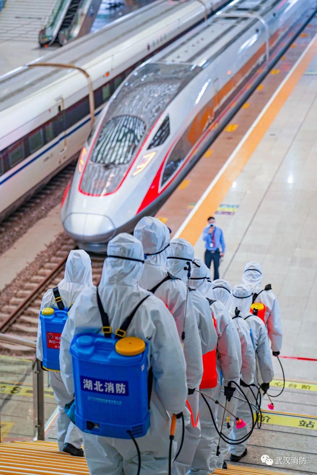 武漢站前,80 名攜帶專業(yè)消毒設(shè)備的消防員集結(jié)到位。