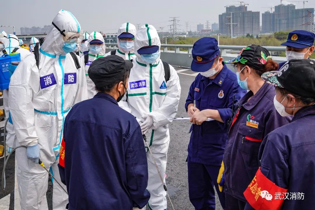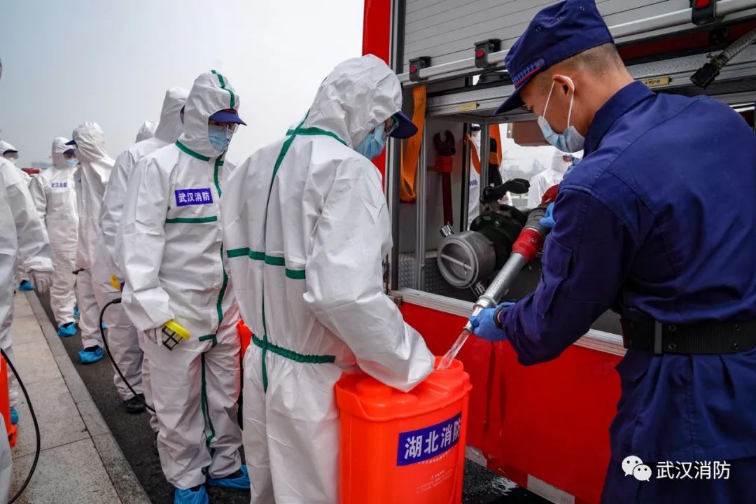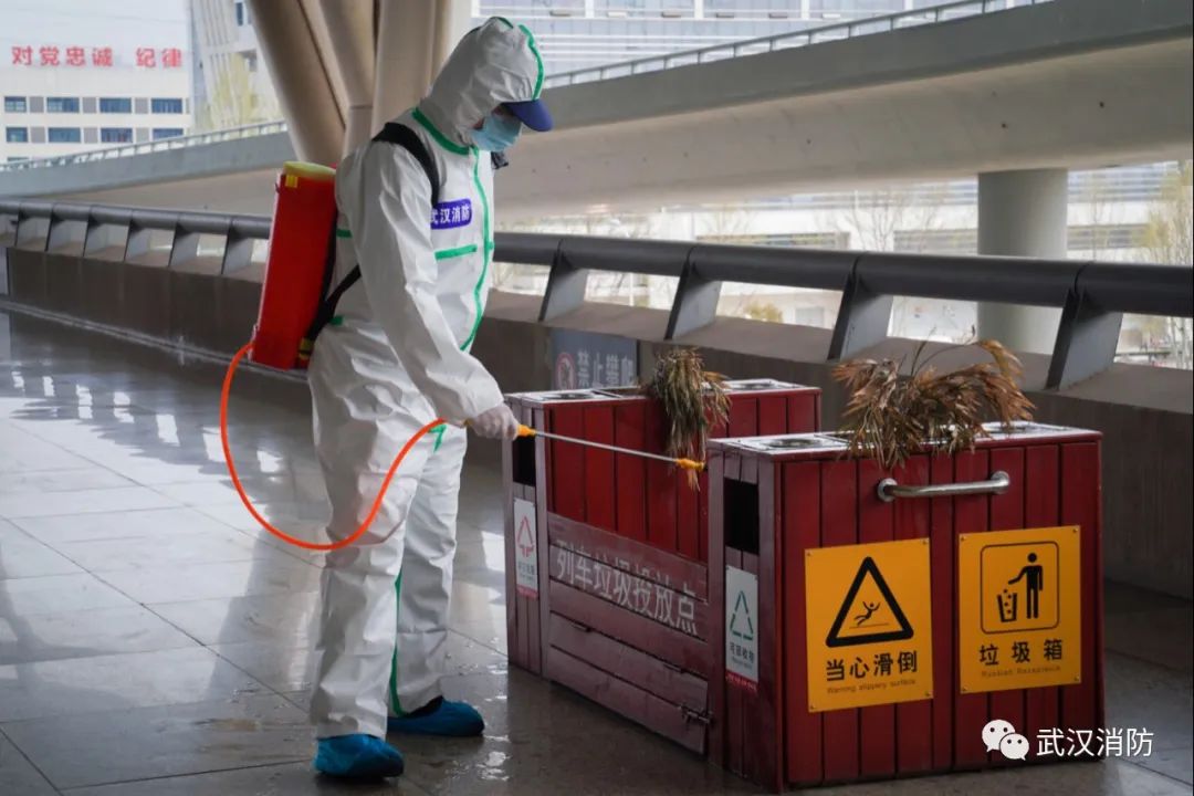 3 月 24 日,在 12 名中央指導(dǎo)組防控組駐武漢市環(huán)境衛(wèi)生與消毒專家工作隊工作人員指導(dǎo)下,武漢市消防救援支隊 80 名消防員,對武漢火車站進(jìn)行科學(xué)消毒。上午 9 時許,80 名消防員在武漢站門前集結(jié)到位,他們配備防護裝備,分成了 8 個組。按照“1+2”消毒勤務(wù)聯(lián)動機制,實行“1 支 119黨員突擊隊+ 1 名衛(wèi)生防疫專家+1 名環(huán)保專家”聯(lián)合消毒模式。