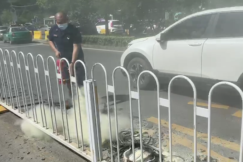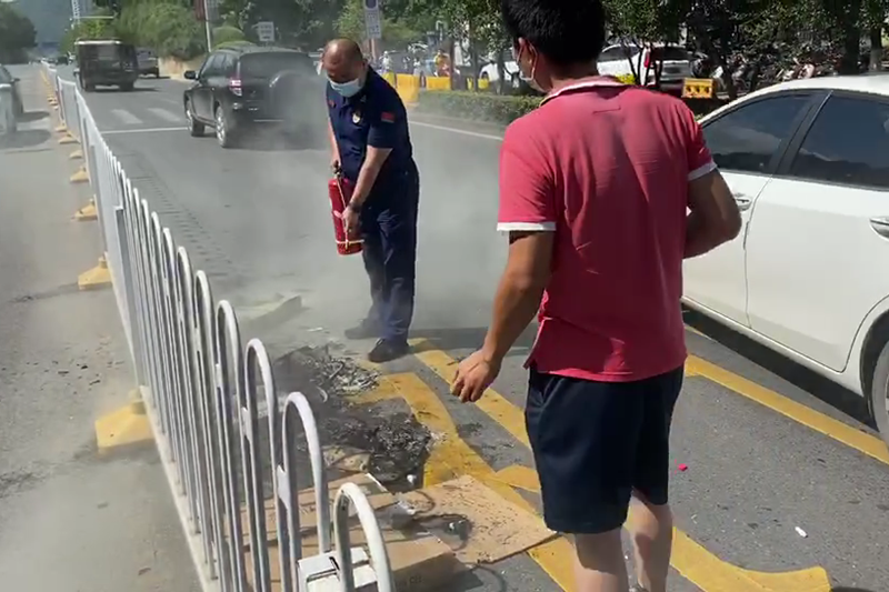 幸運(yùn)的是,這一幕被正在轄區(qū)內(nèi)開(kāi)展消防安全檢查的消防員撞見(jiàn)了!消防員立即從附近商鋪找來(lái)滅火器進(jìn)行撲救。約3分鐘后,明火被撲滅,未造成人員傷亡。
