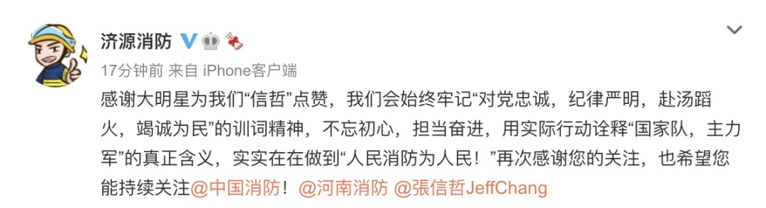 歌手張信哲給消防員張信哲點(diǎn)贊后,@濟(jì)源消防 也回應(yīng)稱會(huì)始終牢記訓(xùn)詞精神 不忘初心,擔(dān)當(dāng)奮進(jìn)。