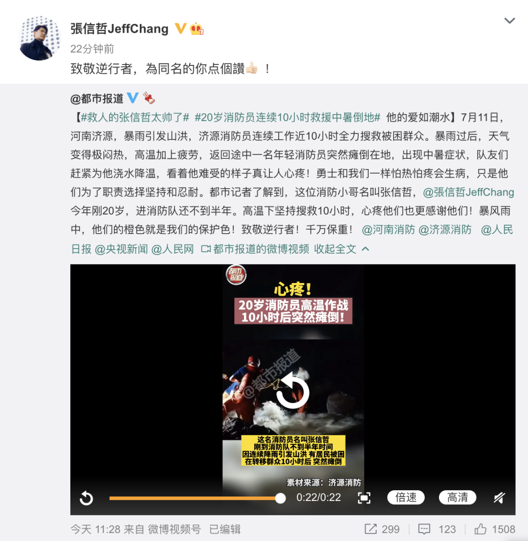 近日 ,00后消防員張信哲讓無(wú)數(shù)網(wǎng)友心疼又感動(dòng)!就連歌手張信哲也發(fā)博點(diǎn)贊 “致敬逆行者,為同名的你點(diǎn)個(gè)贊!”