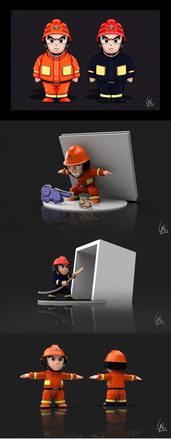 感謝能有這一次機(jī)會為中國消防事業(yè)的發(fā)展做一點(diǎn)貢獻(xiàn)。參與活動、設(shè)計角色的過程中,我也得以更進(jìn)一步了解消防安全知識以及消防救援人員工作的辛苦。在我看來,消防員是勇敢、堅決、耐心、仁慈的,因此我的卡通角色在保持可愛的同時,也通過微表情與肢體語言凸顯出他們果敢堅毅的一面。我的設(shè)計中包含一男一女兩個角色,目的是鼓勵更多女性參與到消防工作當(dāng)中。