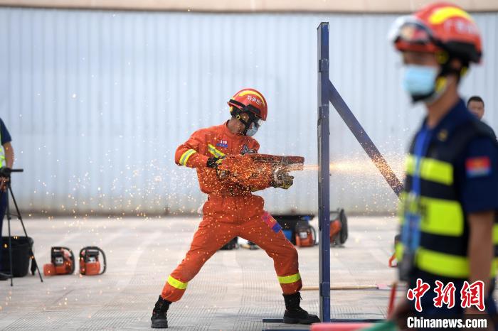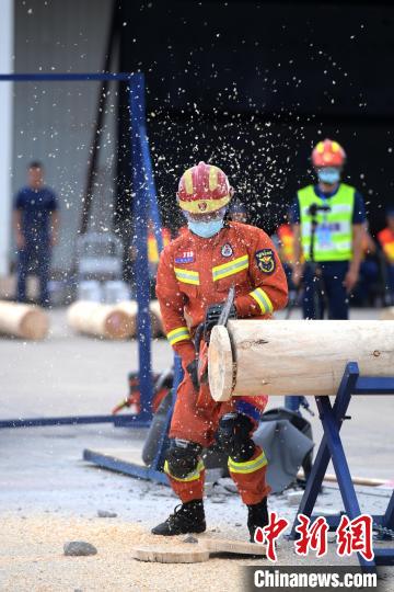 圖為應(yīng)急救援員進行綜合救助項目比拼,使用鏈鋸切割圓木。 俞靖 攝
