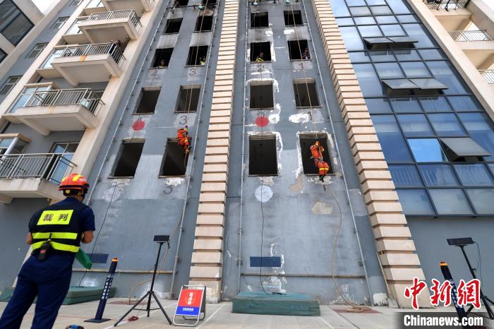 圖為滅火戰(zhàn)斗員進行攻堅技巧項目,用麻繩攀爬上樓。 俞靖 攝