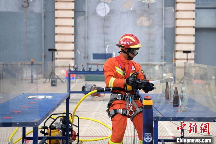 圖為滅火戰(zhàn)斗員進行液壓擴張器轉(zhuǎn)移乒乓球。 俞靖 攝