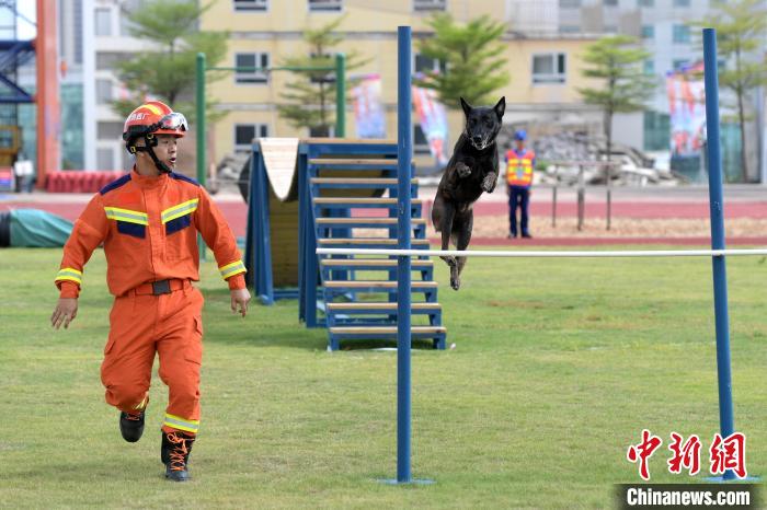 圖為搜救犬訓(xùn)導(dǎo)員指揮搜救犬跨越障礙點。 俞靖 攝